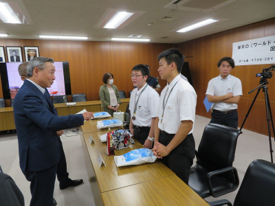 11月7日(火)~11月9日(木)におこなわれる「WRO 2023 パナマ国際大会」(世界大会)に出場する2年電気技術科 帽子(新谷中出身)、山下(保内中出身)のチーム「YTHS 2BY」が、9月27日(水)に八幡浜市に表敬訪問しました。