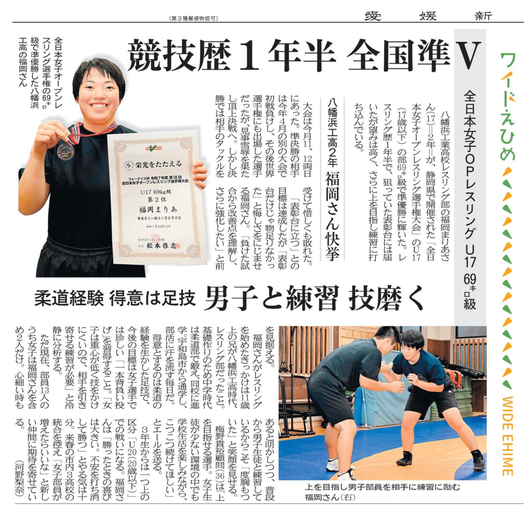 「競技歴1年半 全国準V」2025年10月31日付愛媛新聞